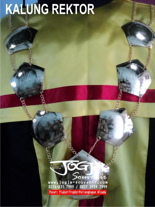 Kalung Rektor/Senat biasanya digunakan rektor/senat kampus untuk acara wisuda. Bahan yang kami gunakan ada 2 macam, kuningan & stenliss, dengan proses pengerjaan di etsa ( tulisan timbul) dengan finishing akhir di sepuh emas/perak
